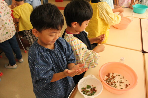 にじぐみは月間絵本「にんじゃでござる」から、忍者ごっこへと発展し、手裏剣を作ったり、忍者の技や生活を調べたり、先日はなんと薬草を作るために公園で色々な草花を採取して、擦ったり、煮詰めたりして薬まで作りました!