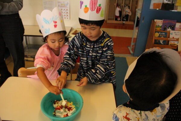 ご紹介しますと、おとぐみは「あっちゃん あがつく」の絵本から、言葉集めをしたり、食べ物を作る見立て遊びから、絵本に出てくる食べ物を作るレストランごっこにまで発展しています。最近は子ども達がメニューを選び、色々な材料を使って食べ物作りを楽しんでいます。