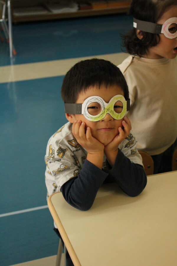 もりぐみはお気に入りの歌から、子ども達のやってみたい!を叶えた活動をいくつも経験しました。“しゃぼんだま”の歌の時期には園庭でシャボン玉を吹いたり、“とんぼのめがね”の歌ではとんぼの目の色のセロファンを貼ったとんぼを作り、それを通して見える世界を楽しみました。