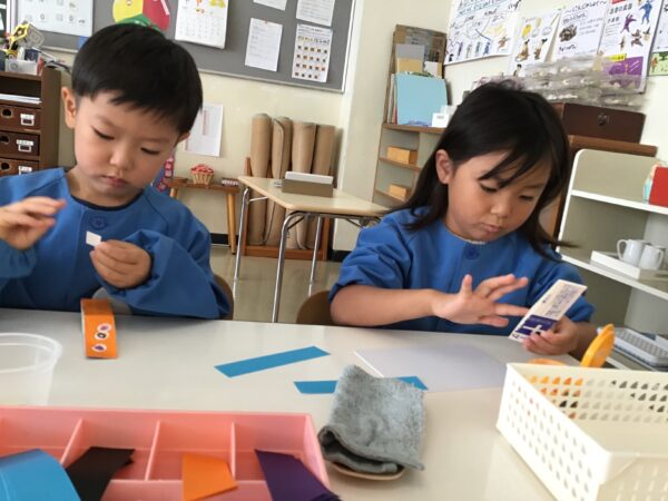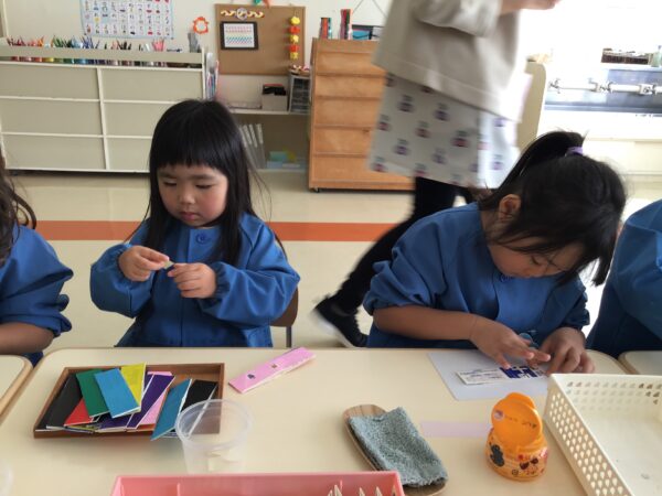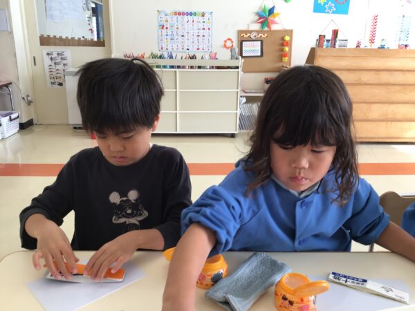 「はみ出ないように貼るの難しいな・・・」お客さんのために丁寧に貼っている年中長さん。