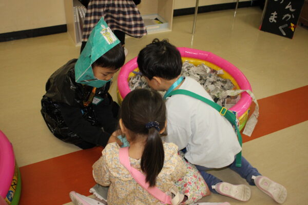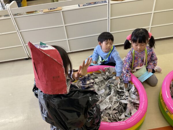目をつぶって、新聞プールの中に手を入れたら、触った感触だけで中に入っているものを当てます。