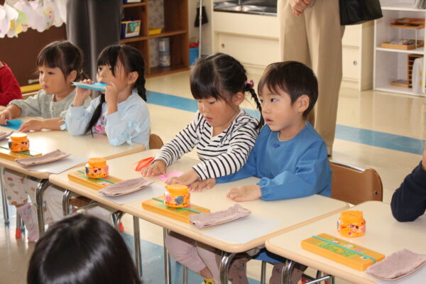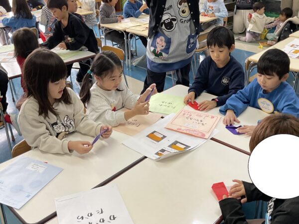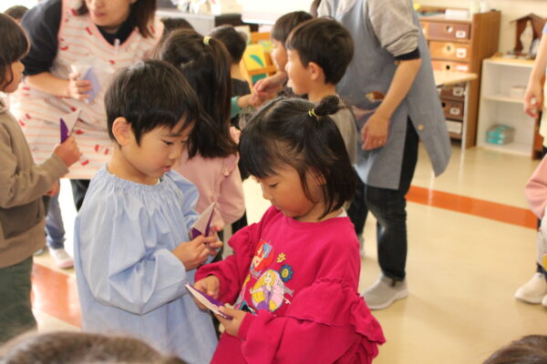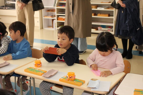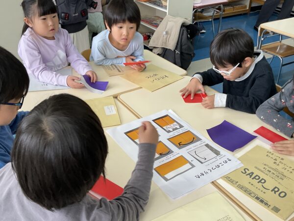 お友達同士で何から折るのか相談したり、分からない箇所があると教え合ったりするのは年長さんならではの取り組みだと思います。