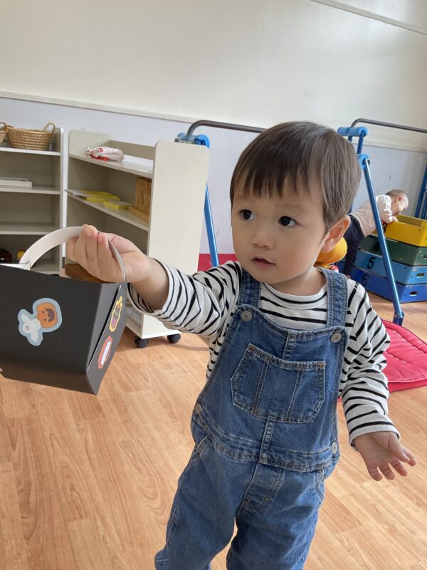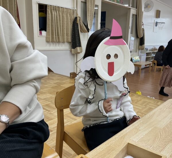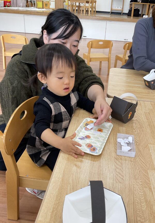 お菓子を入れるカゴも作りました。ハロウィンのシールを貼って可愛くデコレーションしましたよ♪