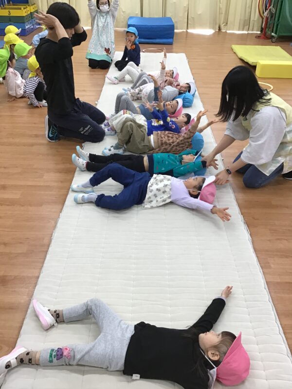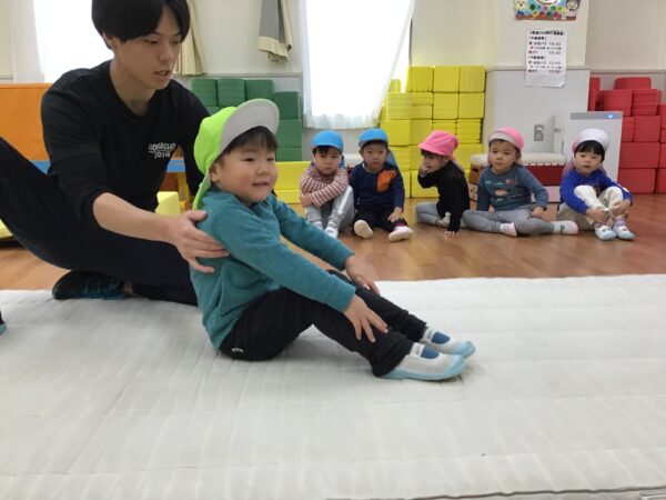 体操教室の内容も、徐々にレベルアップしています!整列や、先生のお話を聞いて動く力が付いてきた子ども達でした。
