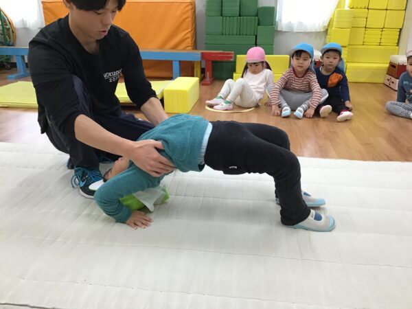年少満3歳さんの体操教室では、「ブリッジ」の練習が始まっています。