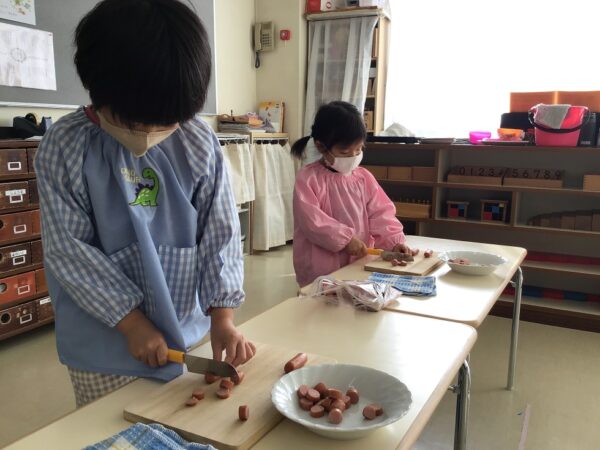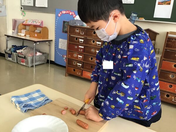 年少・満3歳さんはピーマン、年中さんはハム、年長さんはソーセージを包丁で切りましたよ!