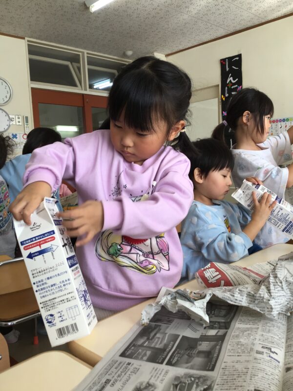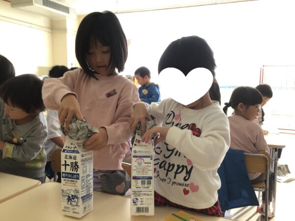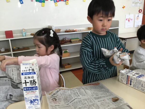 新聞紙を丸めたものを牛乳パックに詰めて・・・