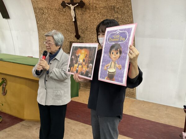 アニメ映画「The Little Drummer Boy」のシーンを題材に、みえこシスターがお話して下さいました。