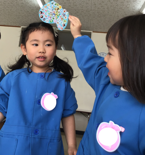 新しいバッジを担任の先生につけてもらい、1つお兄さんお姉さんになったことを喜んでいましたよ♪