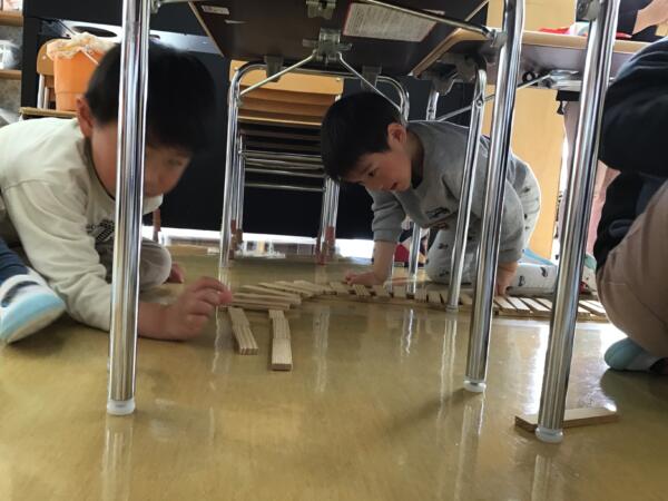 「線路の他に駅も作ろう!」と子ども達からアイディアが出て、お家や木も作りました。