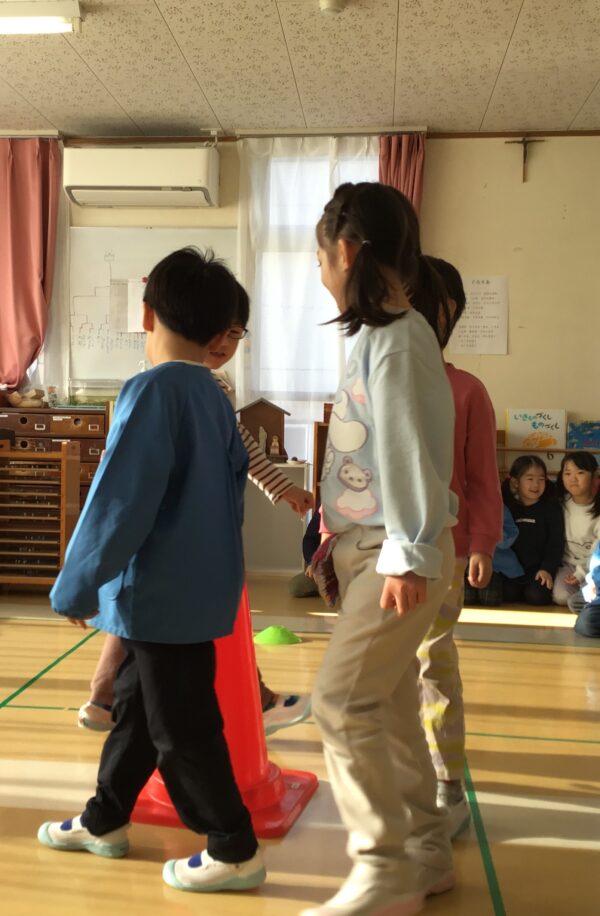 真ん中に置かれたコーンのまわりを歩いて・・・・
