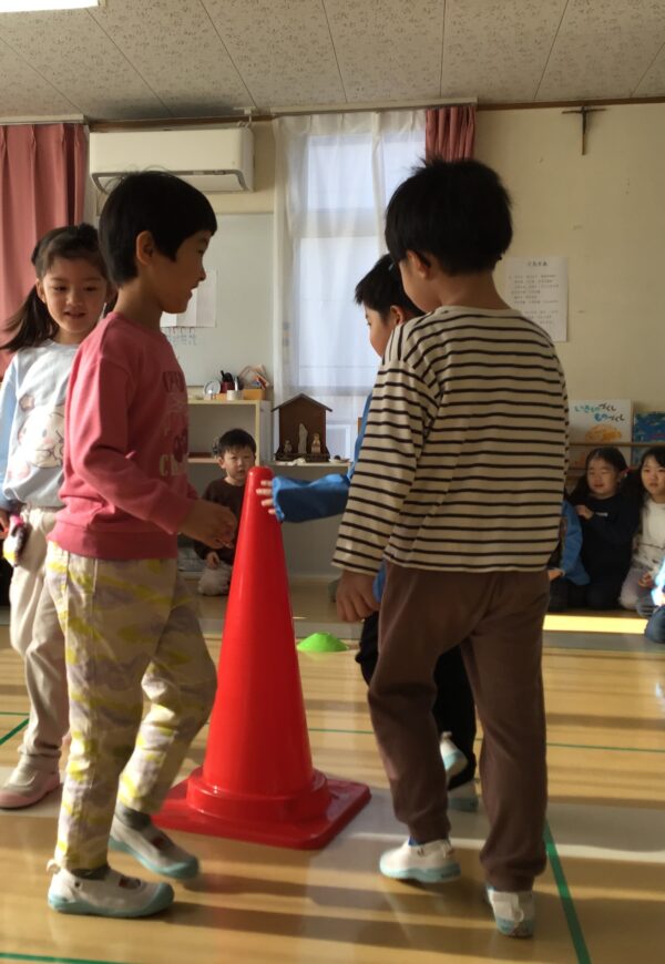 練習前に、新しいゲームにも挑戦!その名も、ぐるぐるコーン取りゲーム!