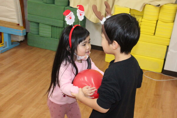 サンタとトナカイに変身して、風船のプレゼントを2人で協力して運びます
