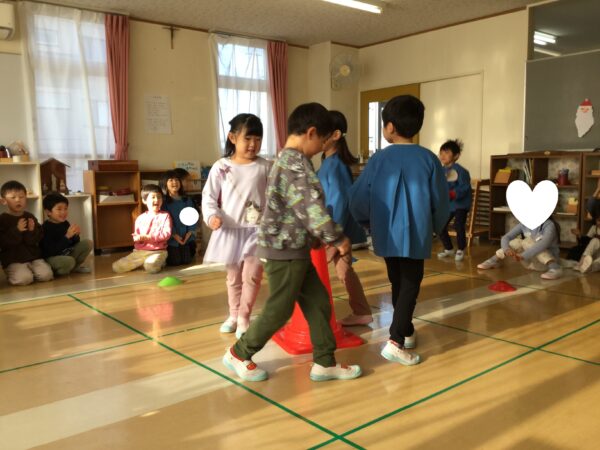 ぐるぐる回っていると、色の名前がコールされるので、外側に並べられているカラーマーカーから、コールされた色と同じものを取りに行くというゲームです。